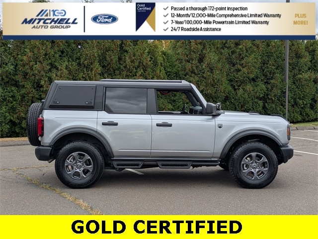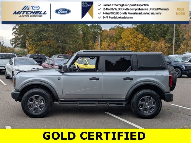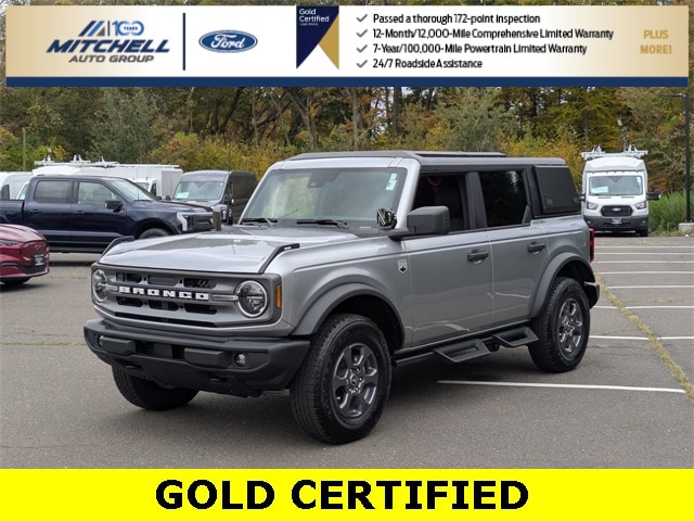 Ford Gold Certified Certified, ** - GOLD CERTIFIED PRE-OWNED FORD BRONCO BIG BEND !!! --- PART OF THE FORD BLUE ADVANTAGE PROGRAM!! - LOCATED AT MITCHELL SELIG FORD IN WINDSOR, CT AT 801 BLOOMFIELD AVE --- RIGHT OFF EXIT 37 VIA ROUTE 91 !!! -- CONTACT US AT 860-688-3651 OR ONLINE AT MitchellSeligFord.com !!!, Alloy wheels, AM/FM radio: SiriusXM with 360L, Auto High-beam Headlights, Auxiliary Switches, Equipment Group 221A Standard Package, Exterior Parking Camera Rear, Front fog lights, Heated door mirrors, Marine Grade Vinyl Bucket Seats, Power door mirrors, Power windows, Removable Hoop Step, SiriusXM Radio w/360L, SYNC 4, Wheels: 17" Carbonized Gray-Painted Aluminum.