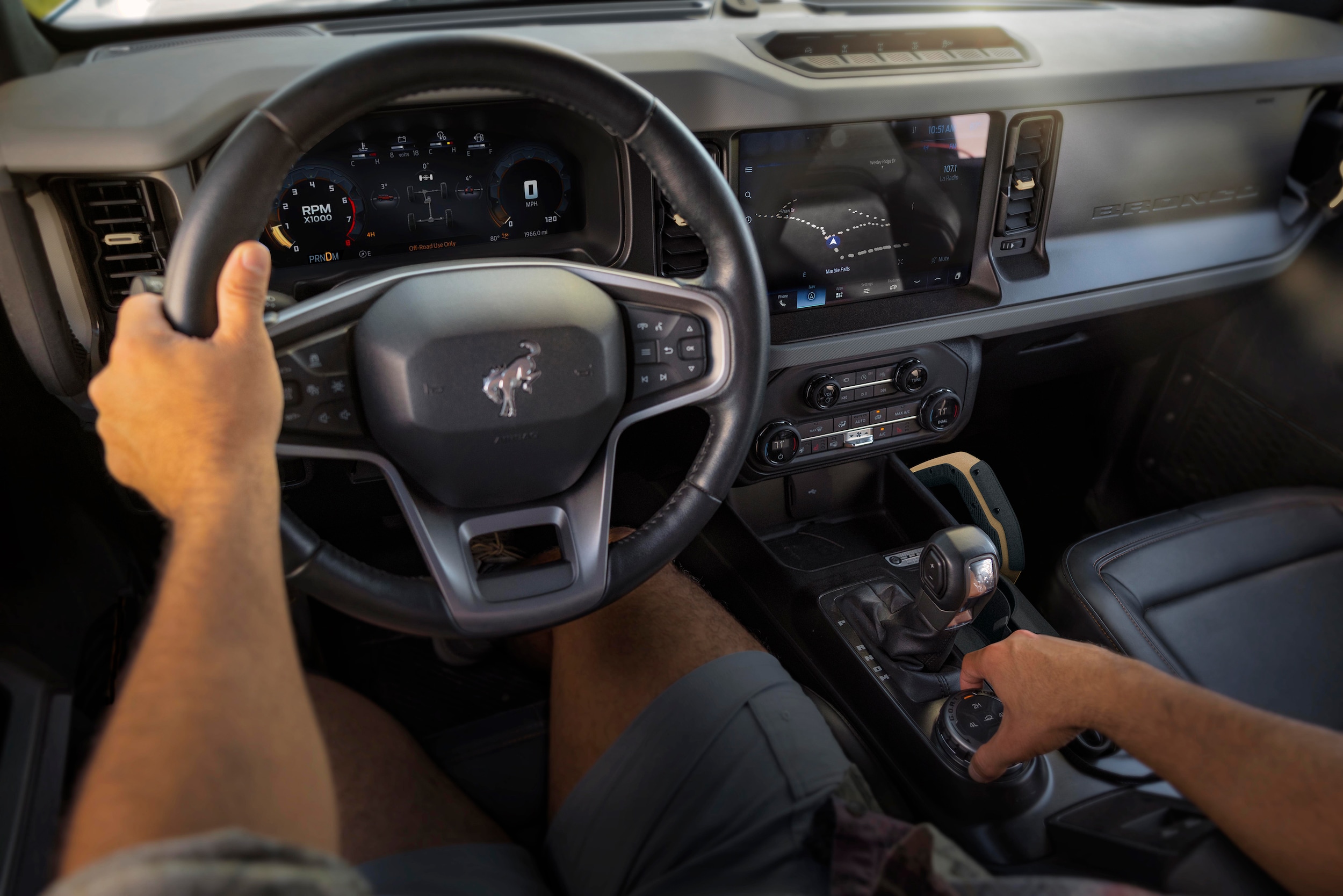Both engines can be paired with either a seven-speed manual transmission featuring a crawler gear or a 10-speed automatic transmission. The manual option includes an ultra-low crawler gear ratio, ideal for technical rock crawling and precise low-speed maneuvering. The automatic transmission offers smooth shifting for a variety of driving scenarios. Advanced four-wheel-drive systems, electronic locking differentials, and multiple terrain management modes help the Bronco deliver exceptional capability regardless of the surface conditions.