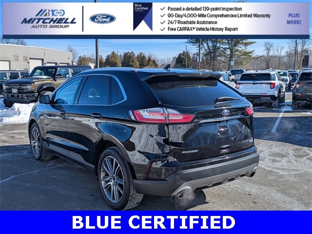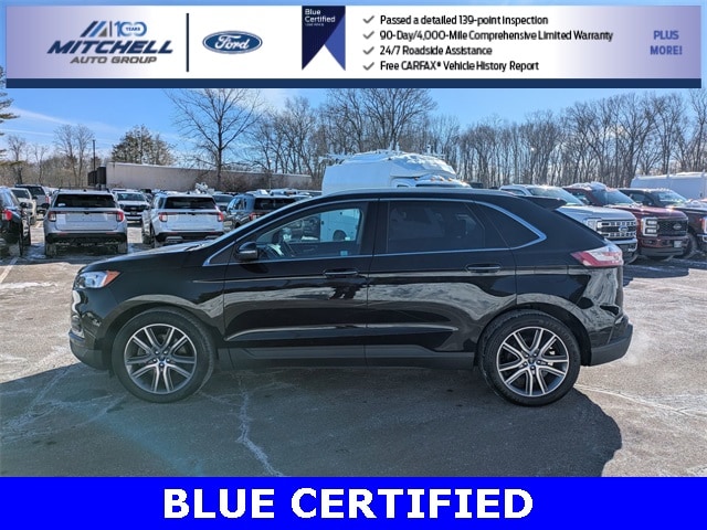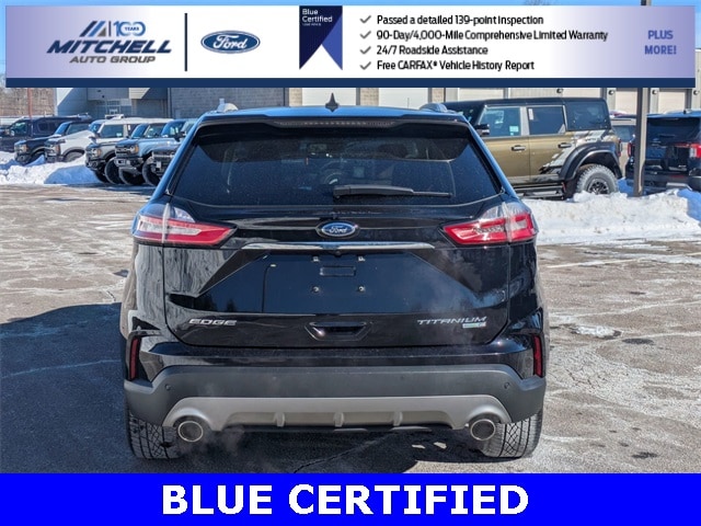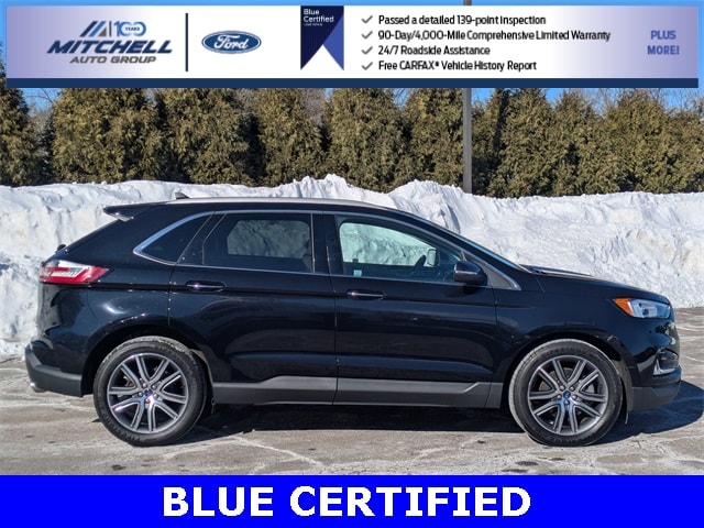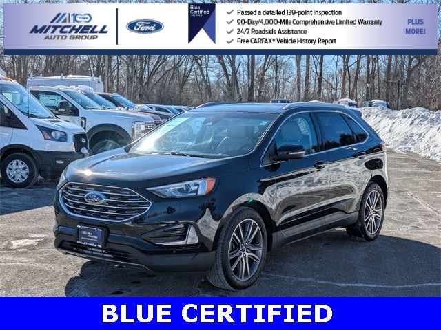 Ford Blue Certified Certified, AWD, ** - BLUE CERTIFIED PRE-OWNED FORD EDGE TITANIUM !!! --- PART OF THE FORD BLUE ADVANTAGE PROGRAM!! - LOCATED AT MITCHELL SELIG FORD IN WINDSOR, CT AT 801 BLOOMFIELD AVE --- RIGHT OFF EXIT 37 VIA ROUTE 91 !!! -- CONTACT US TODAY AT 860-688-3651 OR ONLINE AT MitchellSeligFord.com !!!, Alloy wheels, Auto High-beam Headlights, Automatic temperature control, Equipment Group 300A, FordPass Connect, Front dual zone A/C, Front fog lights, Heated door mirrors, Heated front seats, Heated steering wheel, Leather-Trimmed Heated Sport Bucket Seats, Memory seat, Power door mirrors, Power driver seat, Power Liftgate, Power passenger seat, Power windows, Radio: B&O Sound System by Bang & Olufsen, Rain sensing wipers, SiriusXM Radio, Speed-Sensitive Wipers, SYNC 3 Communications & Entertainment System, Wheels: 20" Bright-Machined Aluminum.